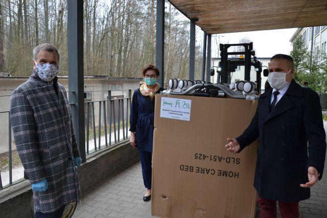 Obecni przy przekazaniu łóżek i wózków starosta Artur Berus, wicestarosta Anna Leżańska oraz dyrektor szpitala Leszek Lepiarz podziękowali prezes Fundacji Eco Textil Monice Lipnickiej za udzielone szpitalowi znaczące wsparcie.