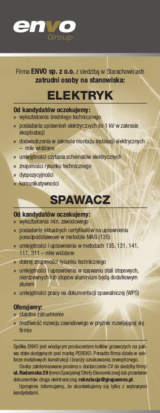 Oferta pracy firmy ENVO sp. z o.o. z siedzibą w Starachowicach