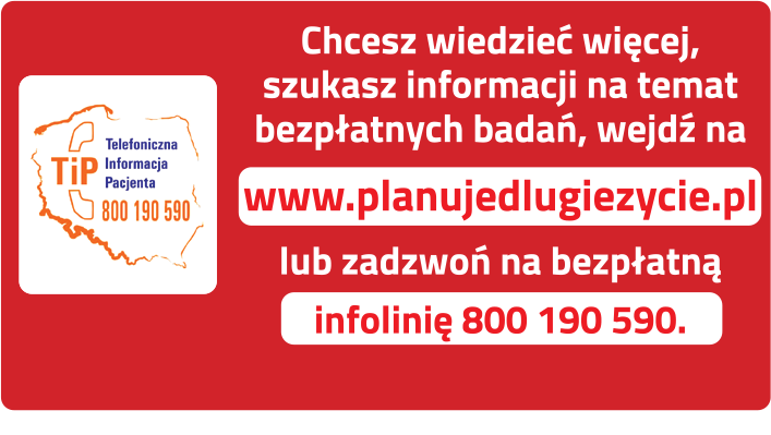 Chcesz wiedzieć więcej, szukasz informacji na temat bezpłatnych badań, wejdź na www.planujedlugiezycie.pl lub zadzwoń na bezpłatną infolinię 800 190 590.