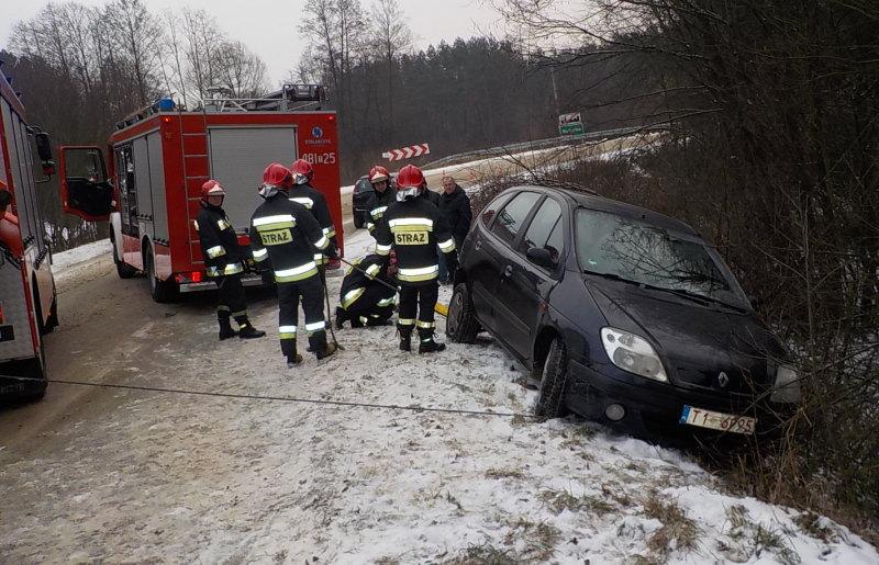 Pojazd marki renault scenic zjechał z pasa jezdni i niebezpiecznie przechylił się na krawędzi przydrożnego rowu. W samochodzie podróżowały trzy osoby, 32-letnia kobieta oraz dzieci w wieku 2 i 5 lat. Jeszcze przed przybyciem ratowników z Komendy Powiatowej PSP w Skarżysku-Kamiennej starsze dziecko przy pomocy osób postronnych zdołało opuścić pojazd. Pozostali pasażerowie samochód opuścili dopiero po pomocy udzielonej przez strażaków. Żaden z pasażerów nie ucierpiał. Auto zostało zabezpieczone przez ratowników przed przewróceniem się do rowu, a następnie przy użyciu wyciągarki wciągnięte na pas jezdni.
