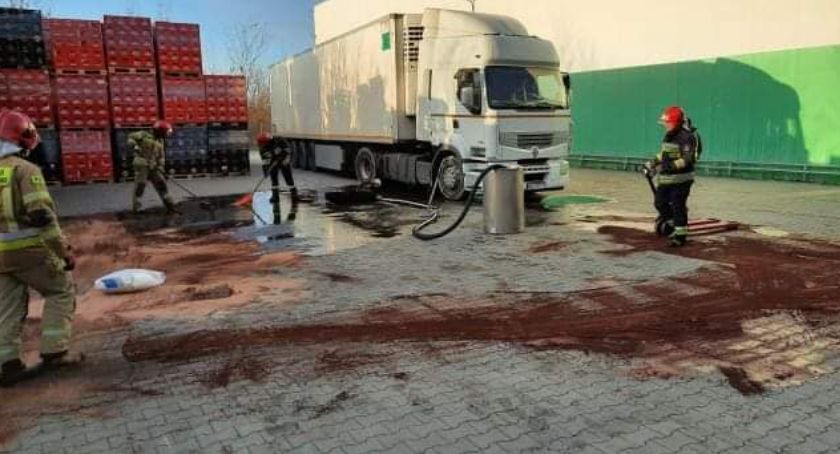Strażacy z JRG Skarżysko Kamienna usuwali wielką plamę oleju napędowego, jaki wyciekł z ciężarówki na placu przy hurtowni.