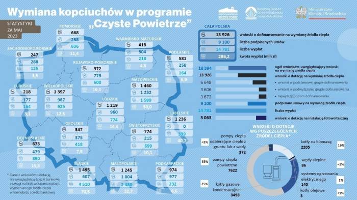 Grafika przedstawia mapę Polski w liczbach i dotyczy wymiany kopciuchów w programie "Czyste Powietrze" za miesiąc maj 2023 roku. W całej Polsce złożono 13.926 wniosków o dofinansowanie na wymianę źródła ciepła, podpisano 9.100 umów i dokonano 14.781 wypłat na łączna kwotę 286,2 miliony złotych. Te same dane przedstawiono dla poszczególnych 16 województw. W regionie świętokrzyskim złożono 774 wnioski o dofinansowanie na wymianę źródła ciepła, podpisano 215 umów i dokonano 699 wypłat na łączna kwotę ponad 10 mln zł. Ogółem złożono 18394 wnioski uwzględniające wnioski na wymianę źródła ciepła, w tym 13926 wniosków o dotację w podziale na podstawową grupę dofinansowania (6648 wniosków), podwyższona grupę (3606 wniosków) i najwyższą grupę (3672 wnioski). Złożono 5063 wnioski o dotację na instalację fotowoltaiczną. Przedstawiono wykres według poszczególnych źródeł ciepła, zgodnie z którym złożono 372 wnioski na pompy ciepła odbierające ciepło z gruntu lub wody, 7622 wnioski na powietrzne pompy ciepła, 3498 wniosków na kotły gazowe kondensacyjne, 2205 wniosków na kotły na biomasę, 86 wniosków na węzły cieplne, 140 wnioski na systemy ogrzewania elektrycznego i 3 wnioski na kotły olejowe.